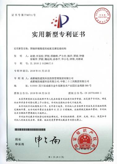2018年9月6日,常州万博全站APP官网登录建築科技投資管理集團有限公司(以下簡稱“建科集團”)正式取得首批三項實用新型專利證書,分别是預制拼裝隧道豎牆的橫向拼接結構(證書号:第7722072号;專利号:ZL201820129415.2)、一種預制拼裝隧道的側牆拼接防水結構(證書号:第7734693号;專利号:ZL201820128819.X)、預制拼裝隧道的底闆支撐連接結構(證書号:第7746711号;專利号:ZL201820128817.0)。