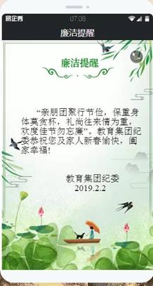 “親朋團聚行節儉,保重身體莫貪杯,禮尚往來情為重,歡度佳節勿忘廉。教育集團紀委恭祝您及家人新春愉快,阖家幸福! ”2月2日,教育集團全體幹部員工收到了一份特殊的“賀年禮物”。 新春将至,常州万博全站APP官网登录教育集團借助信息平台将節前廉潔提醒發送至公司微信、QQ群,在送上節日祝福的同時,進一步提醒全體員工要廉潔過節,自覺抑制各種不良風氣的侵蝕,營造“以廉為榮、以貪為恥、風清氣正”的良好氛圍。