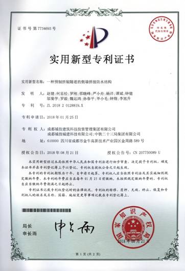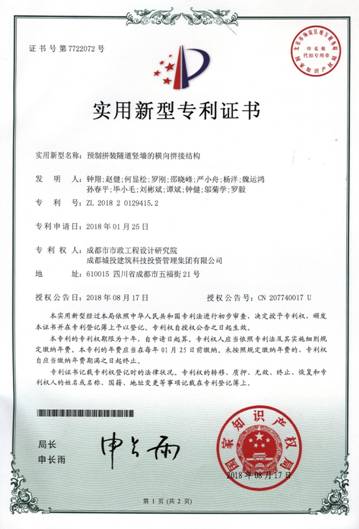2018年9月6日,常州万博全站APP官网登录建築科技投資管理集團有限公司(以下簡稱“建科集團”)正式取得首批三項實用新型專利證書,分别是預制拼裝隧道豎牆的橫向拼接結構(證書号:第7722072号;專利号:ZL201820129415.2)、一種預制拼裝隧道的側牆拼接防水結構(證書号:第7734693号;專利号:ZL201820128819.X)、預制拼裝隧道的底闆支撐連接結構(證書号:第7746711号;專利号:ZL201820128817.0)。